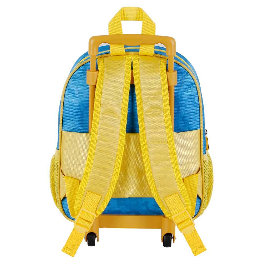 Mochila infantil con ruedas. Compartimento principal con cierre de cremallera y dos bolsillos laterales de malla. Carro no extraible.