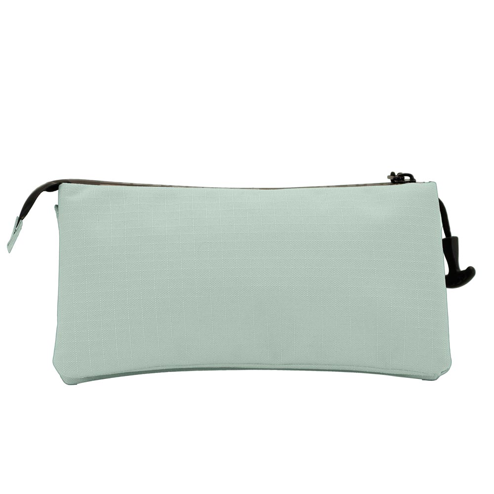 Estuche portatodo rectangular de tres compartimentos con cuerpo repelente a líquidos. Los dos bolsillos exteriores se abren con la cremallera principal y el tercero con una propia.