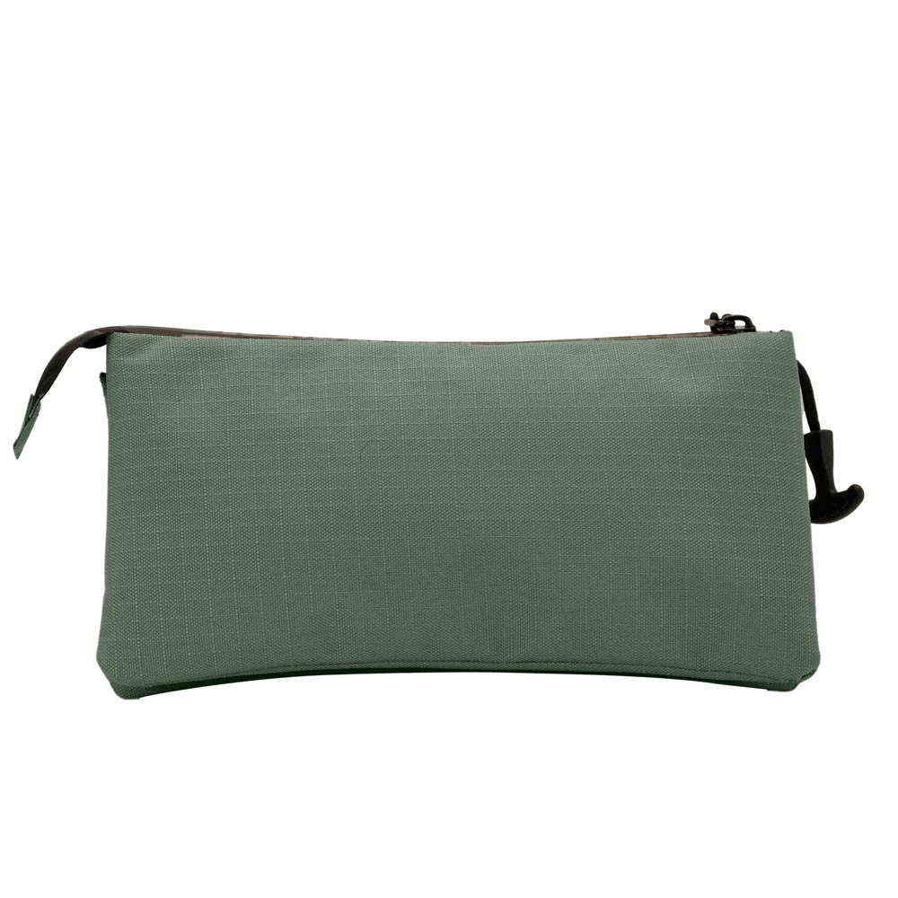 Estuche portatodo rectangular de tres compartimentos con cuerpo repelente a líquidos. Los dos bolsillos exteriores se abren con la cremallera principal y el tercero con una propia.