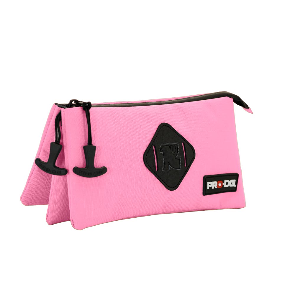 Estuche portatodo rectangular de tres compartimentos con cuerpo repelente a líquidos. Los dos bolsillos exteriores se abren con la cremallera principal y el tercero con una propia.