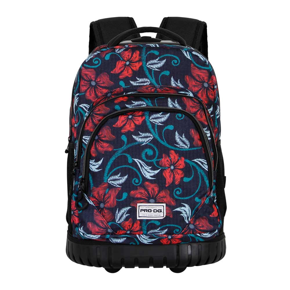 Mochila escolar con 2 ruedas integradas. Dos compartimentos, un bolsillo frontal y dos bolsillos laterales de red. Interior con forro y bolsillo acolchado para dispositivos electrónicos. Correas al hombro para llevar como mochila.