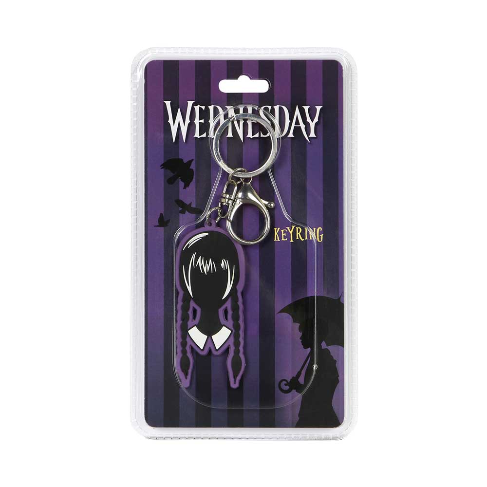 Llavero de PVC blando con cabeza de Miércoles, tanto en el diseño delantero como en el trasero. Incluye anilla y gancho metálicos.